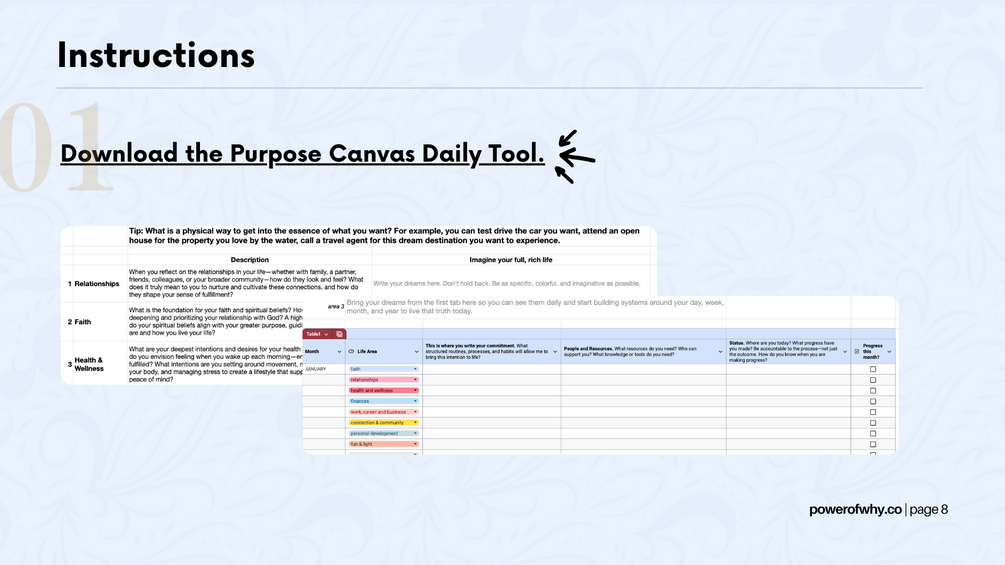 - 🧠 The Purpose Canvas (PDF Guide): Understand how to design your life across 8 dimensions
